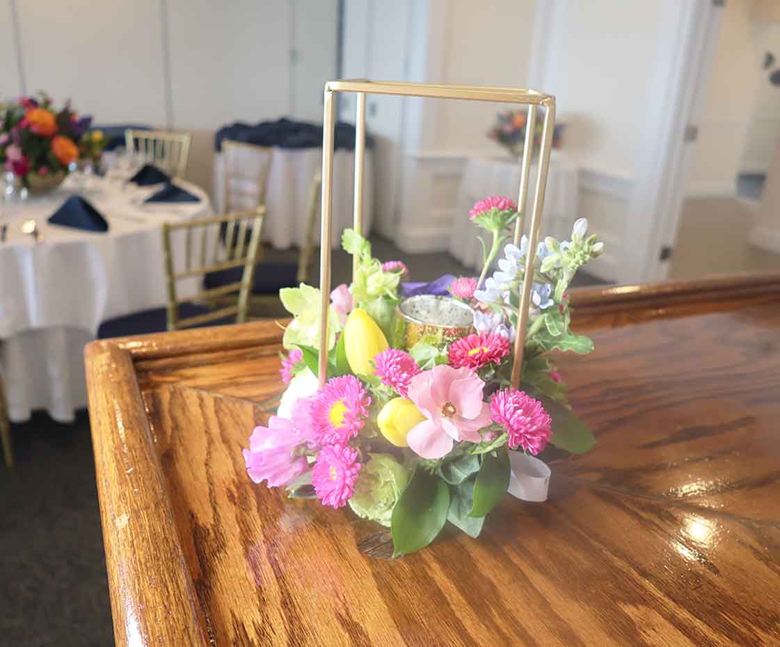 Sweetheart table with floral centerpieces.